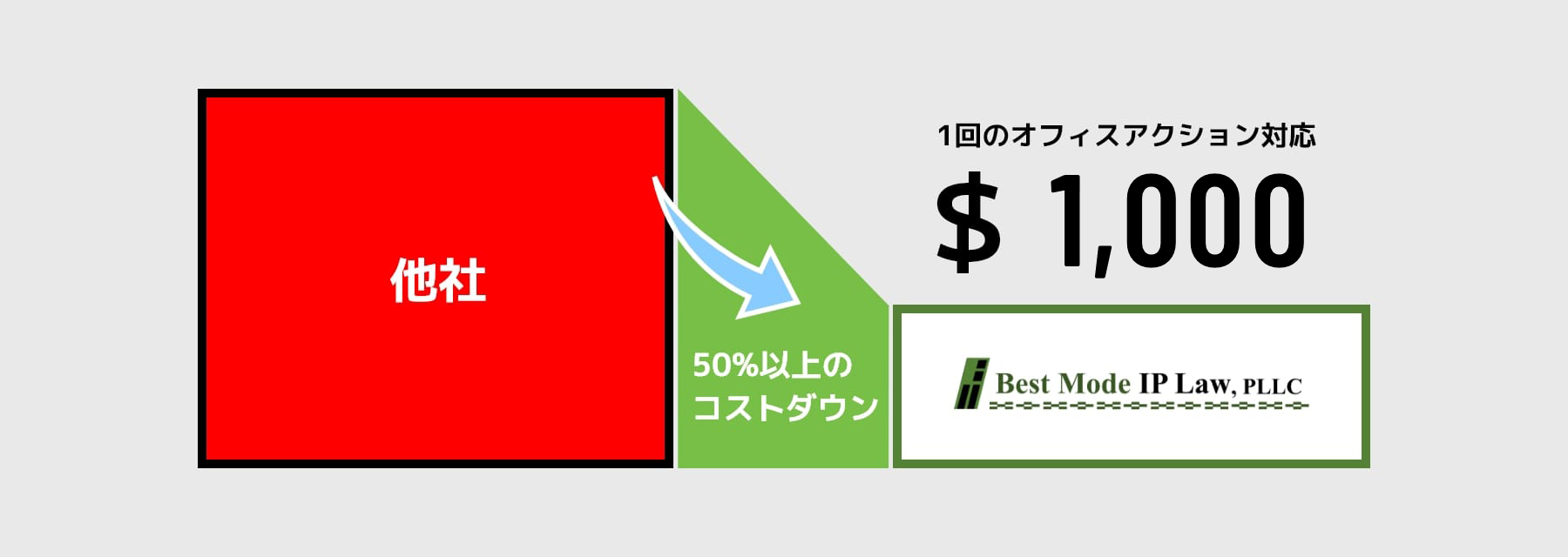 弊所が提案する新サービスでは、米国特許出願(宣誓書, IDS手続, Allowance処理が含まれます)および、1回のオフィスアクション対応を一律1,000ドルにてご提供いたします。このプランは、円安と日米間の物価差を最大限に活用することで、従来の米国特許事務所の料金に比べて50%以上のコスト削減を実現しています。