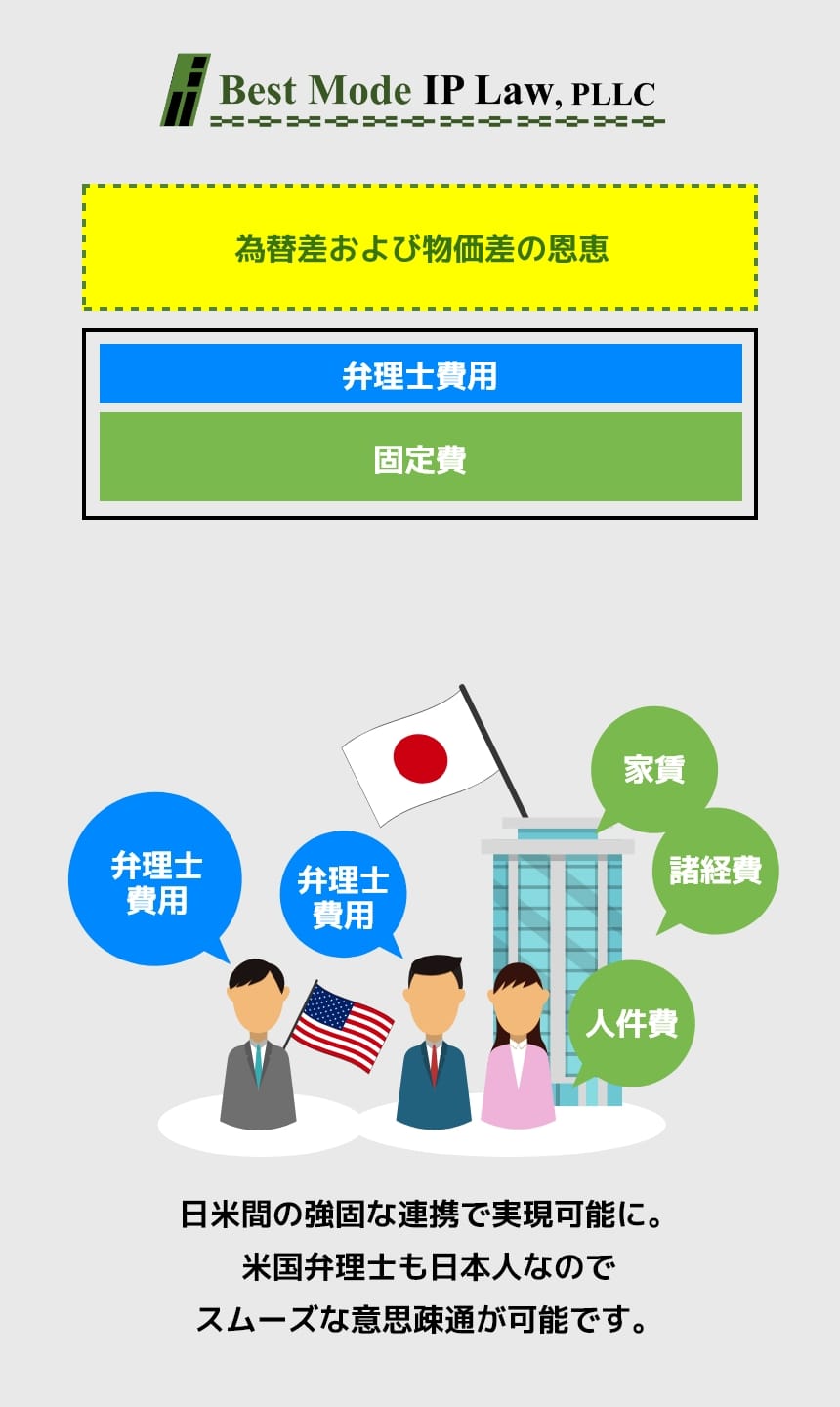 この競争力のある価格を実現するため、弊所は、同グループ傘下にある“Best Mode IP Law Japan”と連携して、管理・運営を行います。より、米国に比べて物価が低い日本において効率的な業務運営を行うとともに、日本人スタッフによる正確かつ綿密な管理体制を確保しています。また、日本在住の実務者が一部の案件を担当することで、為替差および物価差の恩恵を最大限に享受できる体制を構築しております。一般的な米国特許事務所では、収益の約70%が事務所の固定費等に宛てがわれますが、我々は、米国での本社機能を最小限にすると共に管理部署を一部移管することにより、お客様のご負担を最小限に致します。